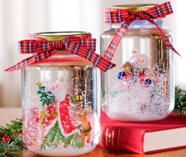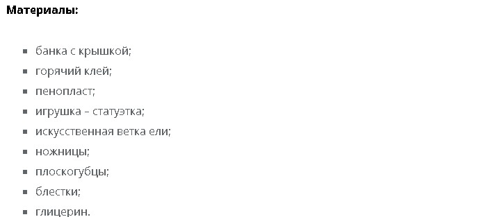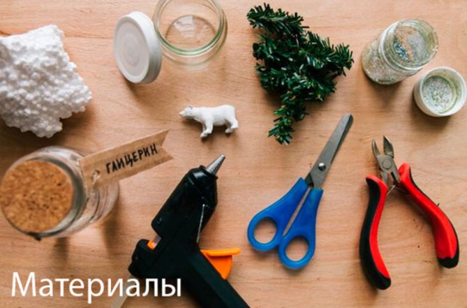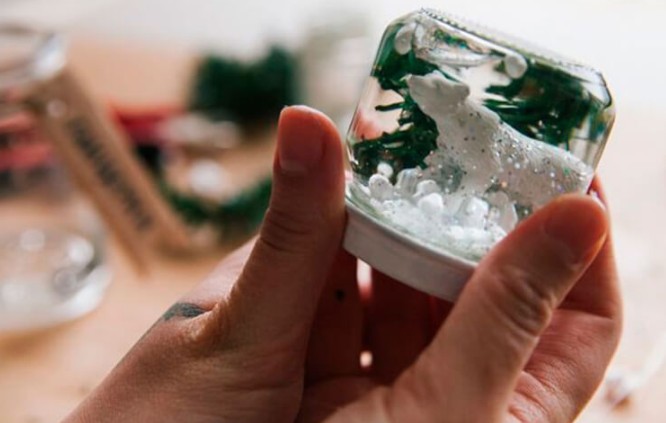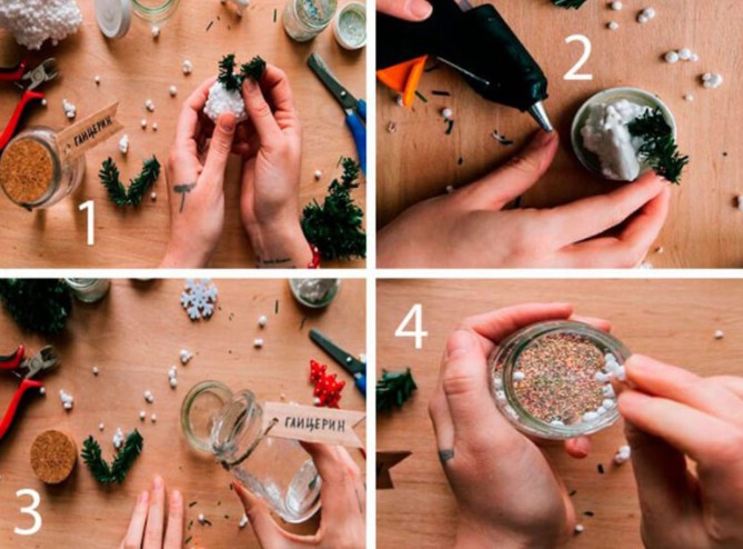 Глицерин разбавить водой, налить в банку, добавить блестки, крышку закрутить и перевернуть.