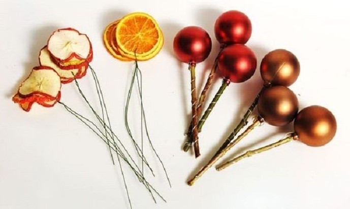 Сухофрукты закрепляют на проволоку, елочные шары — на ветках.