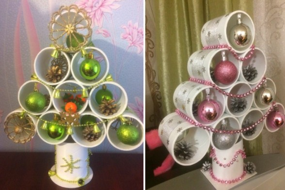 Для изготовления оригинальной елочки понадобится 10-12 стаканчиков, можно использовать втулки из-под туалетной бумаги. Еще понадобятся украшения, клей и немного фантазии. Размер новогоднего дерева может быть любым.