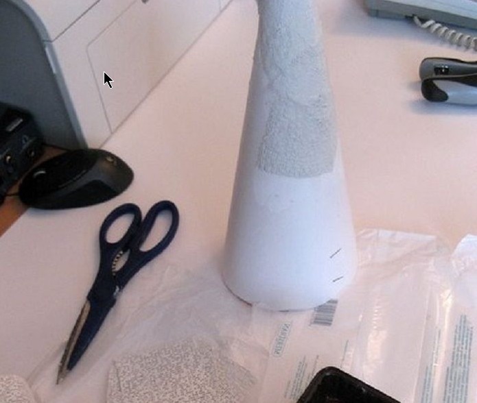 - Кусок пенопласта вставить в центр для устойчивости елочки.