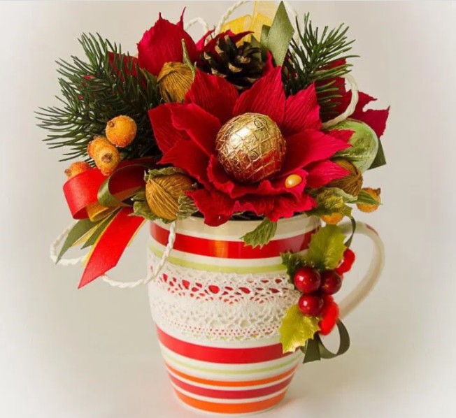 Делается аналогичным образом, в качестве декора использованы искусственные цветы, шишки, ягоды, орехи и шоколадные конфеты.