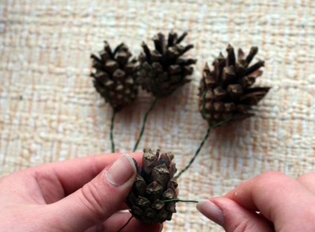 Возьмите флористическую проволоку и проденьте ее в низ шишки, концы соедините и перекрутите