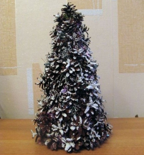Такую елочку можно оставить и без украшений, так как она смотрится очень оригинально. Но, по желанию, дополните ее всевозможным декором в виде еловых веточек, мишуры, бантиков. Декор приклейте с помощью клеевого пистолета.