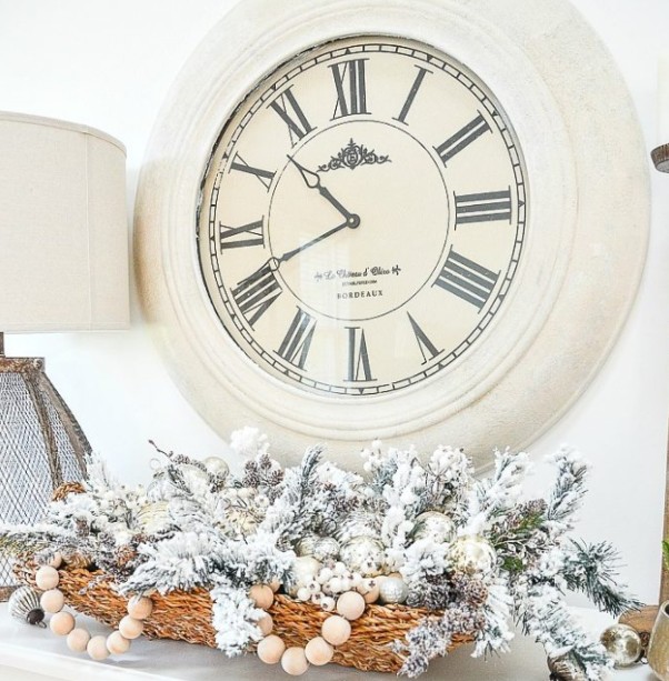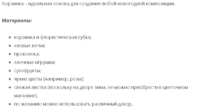 В корзину укладываются разнообразные хвойные ветки. Можно использовать искусственные, припорошенные снегом. Еще один элемент — деревянные бусы, диаметром, 1 см.