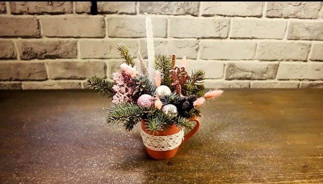 Дополните композицию сухоцветами, в середину вставьте свечу, расставьте все декоративные элементы, палочку корицы и обсыпьте искусственным снегом.