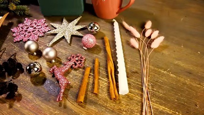 Добавьте декора, например, бусины, небольшие елочные игрушки. Закрепите их проволокой