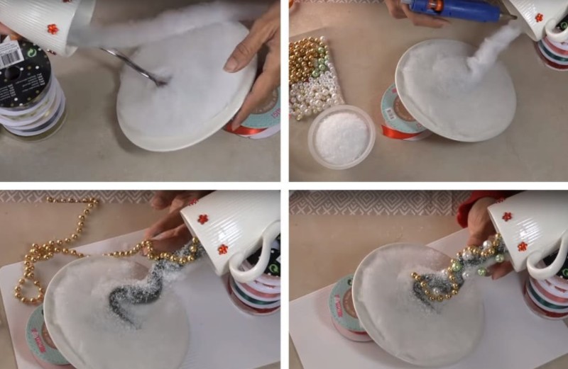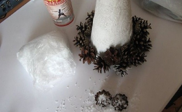 - Промажьте шишки клеем и обсыпьте искусственным снегом.