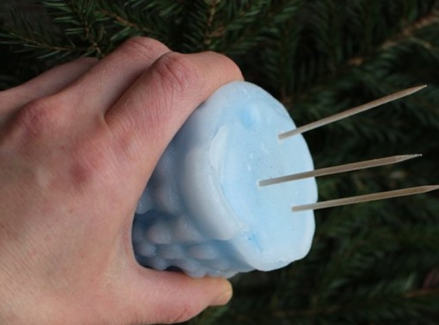 Вставьте зубочистки в основание свечи и поместите ее в центре композиции
