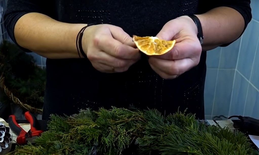 Дополнительные элементы для декора на ваше усмотрение. Это могут быть засушенные фрукты, как на картинке ниже, в которые протыкается проволока и закрепляется на венке.