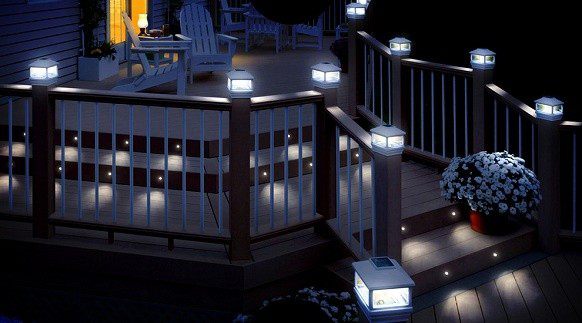Фонари на перила выглядят очень эффектно. За счет их укрепления на балясинах, освещается вся лестница. Вот почему порой достаточно одного или двух светильников.