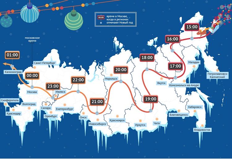 Жители России могут 11 раз поднять бокалы и встретить Новый Год. Начинают праздновать на Камчатке и заканчивают в Калининградской области.