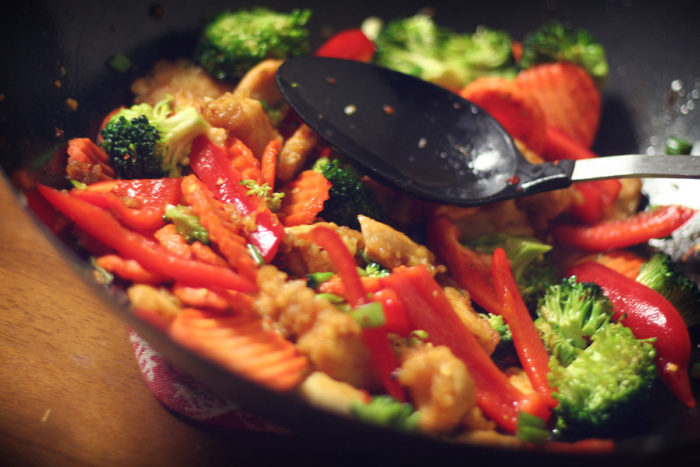 • Овощи готовят в небольшом количестве масла на сильно разогретой сковороде, постоянно перемешивая и подбрасывая кусочки. Этим достигается равномерное обжаривание и пропитывание овощей собственным соком и маслом, скапливающимся на дне сковороды. Эта техника приготовления называется стир-фрай.