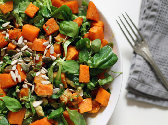 4. Поджаривают очищенные тыквенные и подсолнечные семечки, посыпают салат.