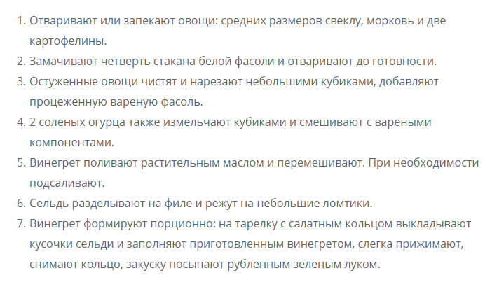 Винегрет — распространенная и любимая закуска из отварных овощей. Существует множество вариантов приготовления винегрета с разным овощным набором, соусов-заправок и формами подачи на стол. Предлагаем классический вариант холодной закуски, а добавление кусочков малосольного филе сельди делает это блюдо необычайно вкусным с новыми аппетитными нотками.