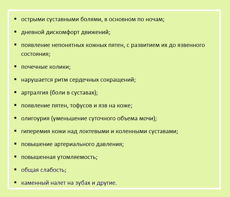 После преодоления допустимого барьера кислота кристаллизуется, оседая в соединительной ткани суставов. Обычно это суставы кистей рук и ног. Человека преследуют сильные боли, воспалительные процессы в этих местах. При несвоевременном лечении развивается артрит, может подключиться подагра.