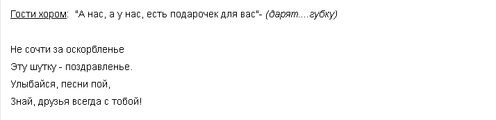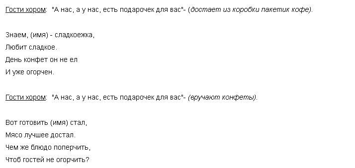 В этой сценке принимают участие все гости, которые должны кричать в нужный момент — А у нас а у нас есть подарочек для вас.