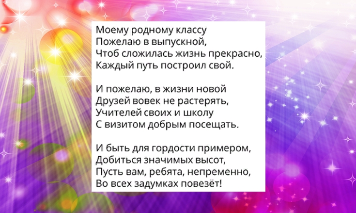 После окончания начальной школы, предметы преподаются ученикам разными учителями. И это правильно, так как только предметник владеет полностью конкретной наукой и может передать знания по ней в полном объеме. За время учебы ребята привыкают к своим учителям-предметникам и не хотят с ними расставаться. Поэтому слова напутствия очень важны для выпускников, ведь им предстоит вступить в новый еще не изведанный мир, где возможно, будут другие преподаватели.