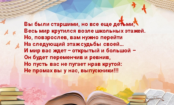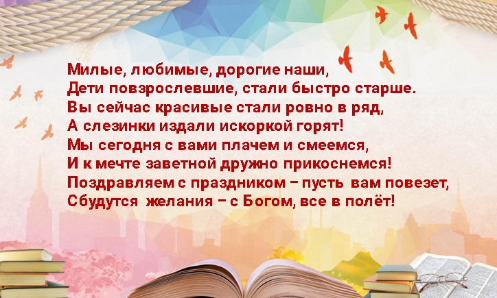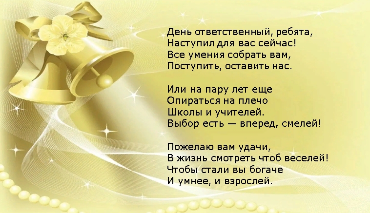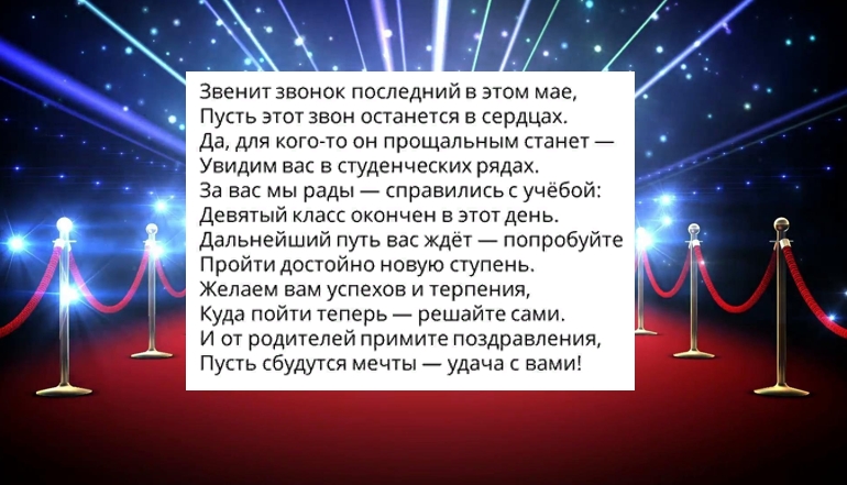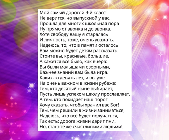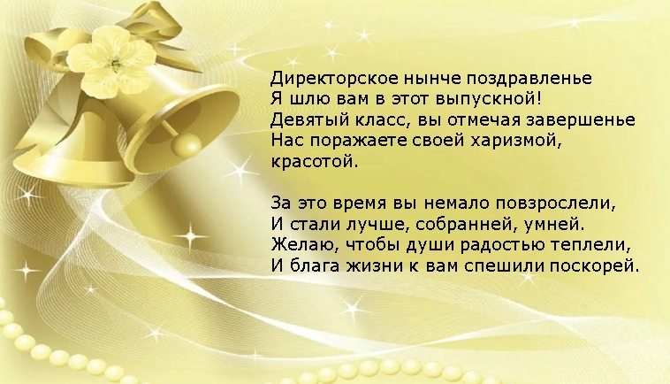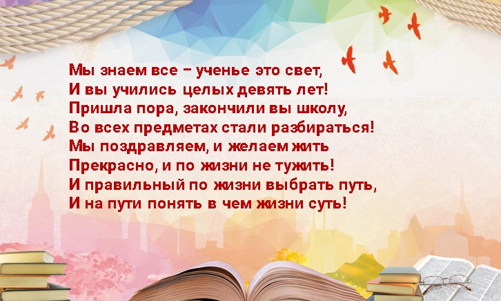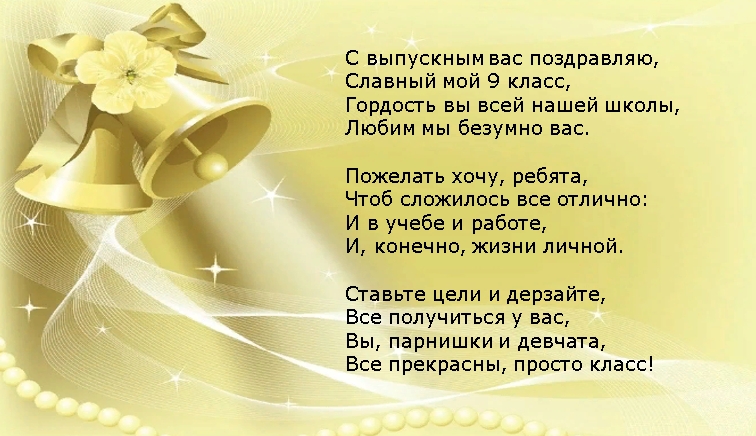 - Любимые наши дети! Вот и настал день окончания девятого класса! Мы вместе с вами прошли этот очень важный путь, переживали, когда вы получали двойки и радовались вашим пятеркам. Теперь все это позади, но впереди у вас жизнь еще более ответственная, вы повзрослели и многое должны решать сами. Какую бы дорогу вы не выбрали, вы всегда можете рассчитывать на нашу поддержку. Перед вами открыты все двери, можно сказать, целый мир, но очень важно найти свою дорожку и смело по ней идти. Примите наши поздравления и пожелания всего самого доброго, позитивного! Учитесь, старайтесь и тогда все у вас получится.