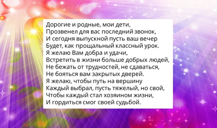 Важным человеком для всех учащихся является классный руководитель. Именно с ним ребята решают многие свои проблемы в учебе и в отношениях со сверстниками. Даже некоторые свои тайны дети доверяют только ему. Когда настает день прощания, вместе с радостью все испытывают и грустные чувства. Выпускники с волнением ждут пожеланий от самого любимого человека в школе, который провожает своих питомцев в другую неизвестную еще жизнь.