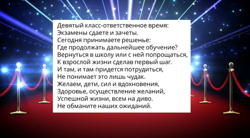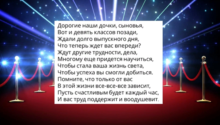 - Дорогие наши ребята! Мы, родители, сегодня вместе с вами собрались в этом зале, чтобы поздравить вас с завершением учебы. Это первый серьёзный этап в вашей жизни. Теперь перед вами стоит выбор — продолжить обучение в школе или получить профессию на ряду со среднем образованием в другом учебном заведении. В любом случае мы надеемся, что дальнейший ваш путь будет хоть и трудным, но очень светлым. Желаем вам добиться всего, что задумано, новых побед вам и свершений!