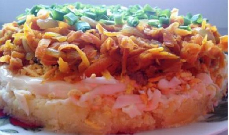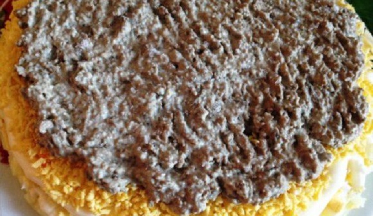 Невесомый салатик с нежнейшей печенью приведет в восторг ваших гостей. Все составляющие крупно натираются, обильно смазываются слои. Закуска очень сытная и одновременно легкая. Готовьте сразу две порции, так как гости будут просить добавки.