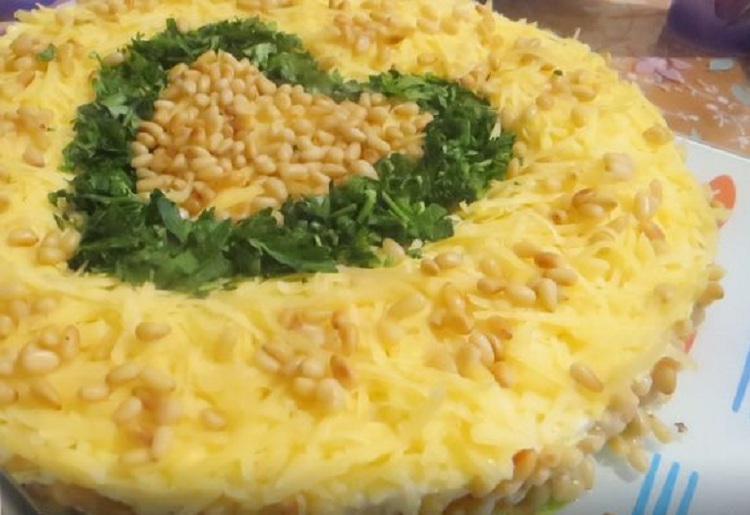 Нежнейший салатик, очень аппетитная и сытная закуска. Готовится быстро, натертые ингредиенты складываются поочередно в форму. Насыщенность вкуса дают подрумяненные орешки, в комбинации с остреньким соусом, божественное наслаждение.