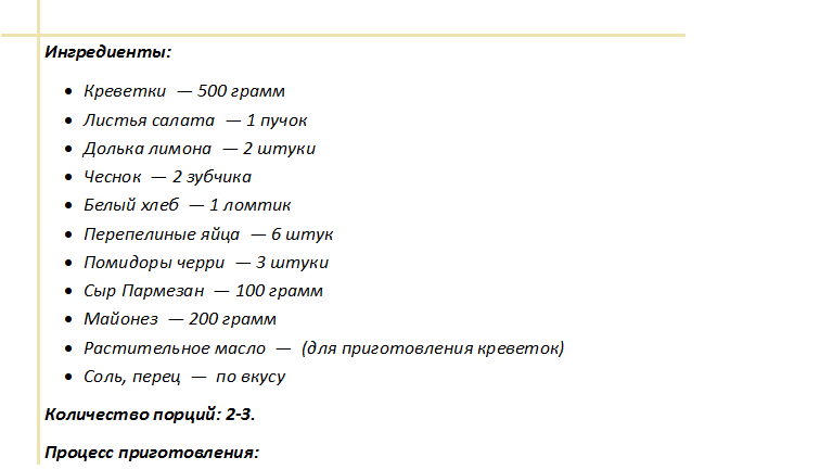 Креветки обжариваются до образования легкой корочки. Тарелку устелить рваными листьями, выложить разделенные на части томаты с яйцами, гренки. Полить чесночным соусом. Посыпать тертым пармезаном, украсить дольками лимончика.
