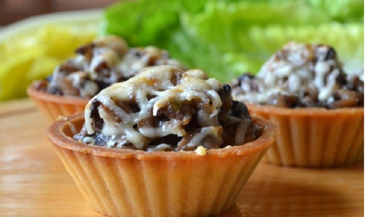 Мелко измельчить грибочки и луковички, обжарить до готовности, сыр натереть. Наполнить корзиночки остывшей грибной массой, посыпать сыром. Перед подачей украсить зеленью.