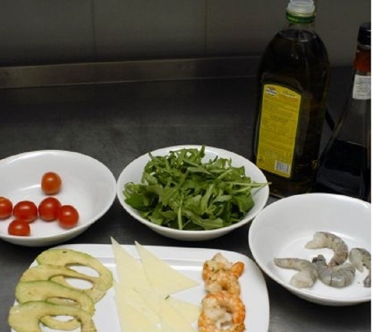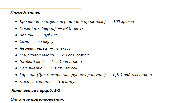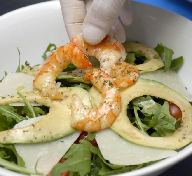 Для этого салата креветки обязательно обжариваются. Выкладка ингредиентов проводится поочередно. Изначально укладываются салатные листья, очередность в описании ингредиентов.