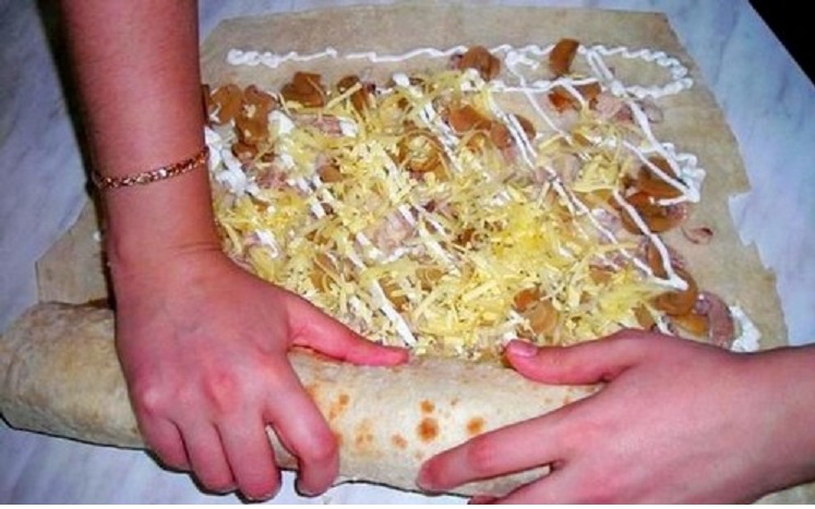 Если немного повозиться, разрезать лаваш на несколько квадратных частей, можно сформировать небольшие конвертики. Начинку класть в каждый, свернуть, поджарить.