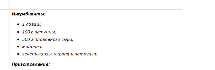 Ветчина нарезается большим и тонким кружком. Лист лаваша промазать обильно плавленым сыром, посыпать измельченной зеленью. Поверх уложить кружки ветчины, сформировать плотный рулет. Завернуть в пленку, можно обвязать шпагатом или лентой, отправить в холодильную камеру часика на два, подавать с зеленью.