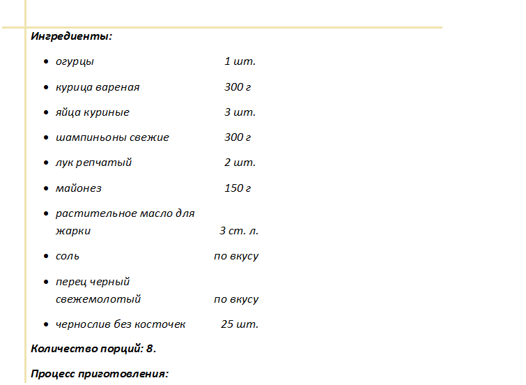 Нежный, изумительный, вкус этого салатика навряд ли кого-то оставит равнодушным. Свежесть летнего огурца, оригинальное соединение курочки и чернослива, подарит ни с чем не сравнимый вкус.