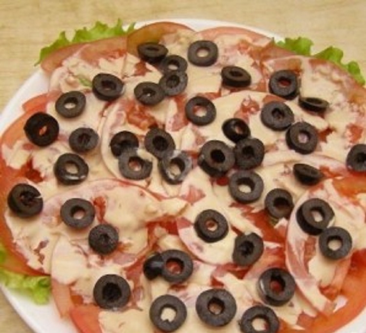 Вымытые плоды нарезают кружочками. Выдерживают в рассоле до одного часа. Просушить, обвалять в муке, прожарить с двух сторон. Все оставшиеся ингредиенты нарезаются кружками. Прожаренные кружки баклажанов смазать чесночным майонезом, уложить слоями подготовленные ингредиенты. Украсить маслинами, зеленью.