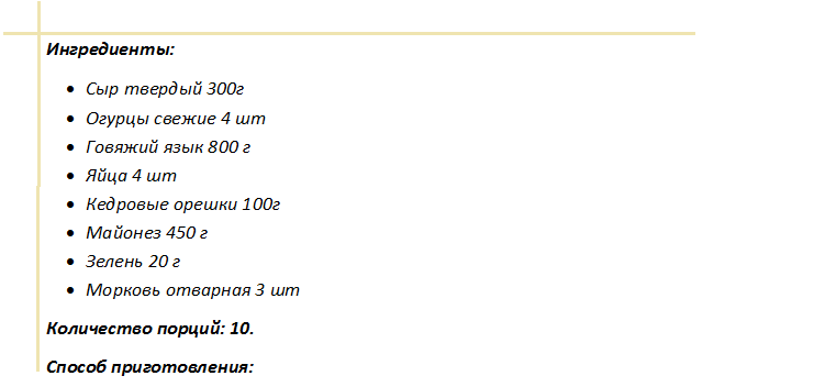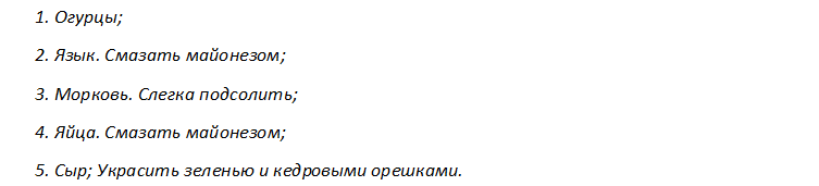 Измельчить соломкой отварной язык, огурчики. Все остальные ингредиенты натереть. Собирать лучше на плоской тарелке.