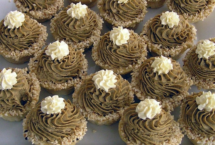 Для приготовления таких изысканных корзиночек нужно обжарить печень. Лучше во время жарки добавить мелко нарезанного лучка. Начинка будет сочная и очень нежная. После обжарки остывшую печень либо пропустить через мясорубку, либо измельчить с помощью блендера. Наполнять из специального мешка, предварительно увлажнив верх корзинки в водичке, посыпать кунжутом.
