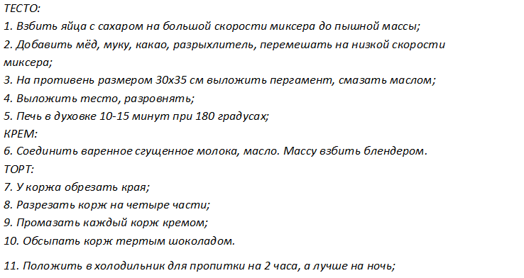 Безупречное сочетание какао, меда, горького шоколада обязательно понравится вашим гостям. Тортик готовится очень просто, процесс приготовления не отнимает много времени.