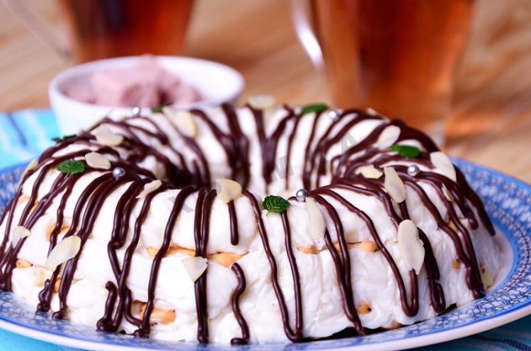 После того, как все сложили в форму, отправьте ее на холод для полного застывания массы. Застывший тортик перевернуть, аккуратно вынуть, полить растопленным шоколадом, украсить по желанию.