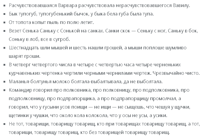 Конкурс на произношение скороговорок. Ведущий предлагает присутствующим посоревноваться, кто лучше всех проговорит быстро скороговорку. Приглашает желающих и раздает им карточки со скороговорками. Каждый участник сначала громко и четко читает, что написано на карточке, чтобы все слышали, затем, по команде ведущего, произносит в быстром темпе. Кто не допустил ни одной ошибки, выигрывает.
