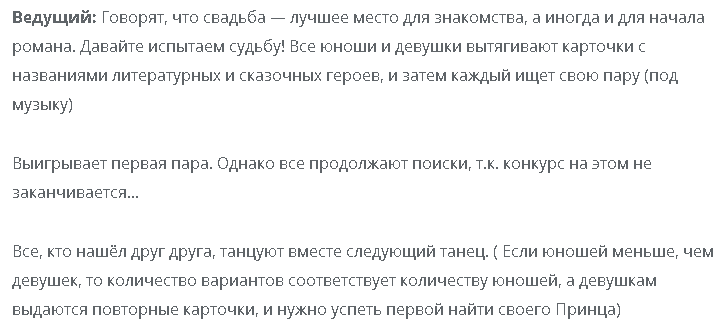 Конкурс «Испытай судьбу», в результате которого будут выявлены самые лучшие пары — танцевальные, быстрые, идеальные и т.д. По завершении выбранным парам вручаются призы.