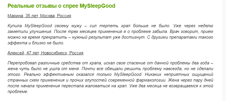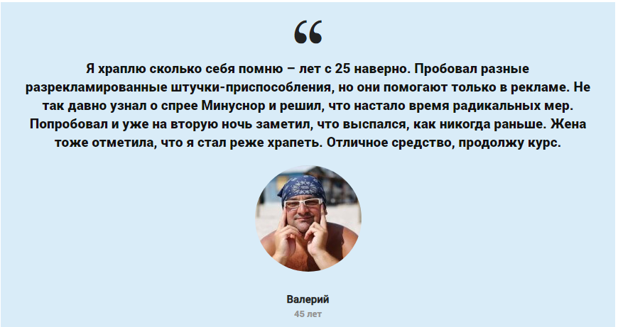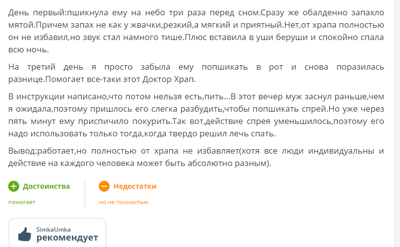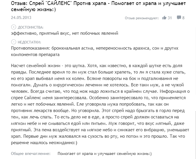 Антихрап -в составе эфирные масла мелиссы, облепихи, лаванды, эвкалипта. Действия, которые оказывает этот спрей — мышцы приводит в тонус, отечность устраняет, расслабляет, улучшает циркуляцию крови. Распылять нужно в горло, перед сном. После этого нельзя принимать пищу и есть.