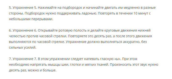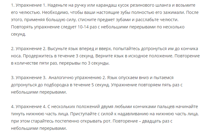 «Жвачка» — двигайте нижней челюстью, как будто жуете жвачку. Выполняйте 10 минут, с перерывом. Всего — 4 раза.