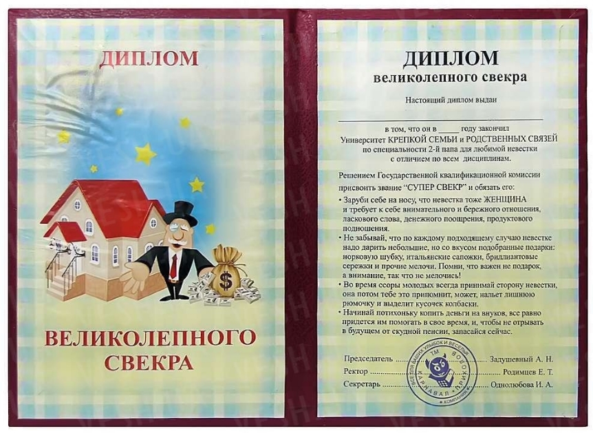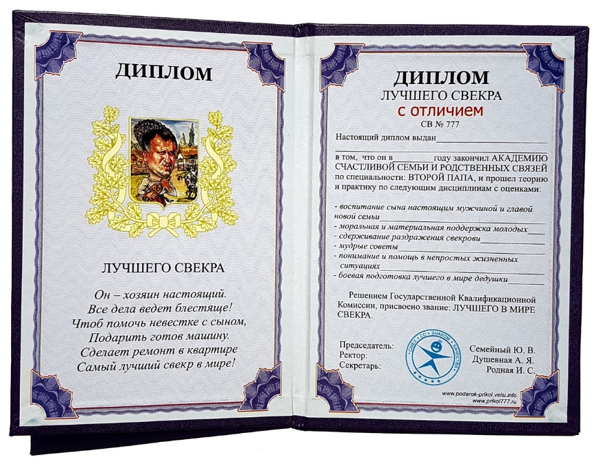 • Диплом с отличием для свекра;