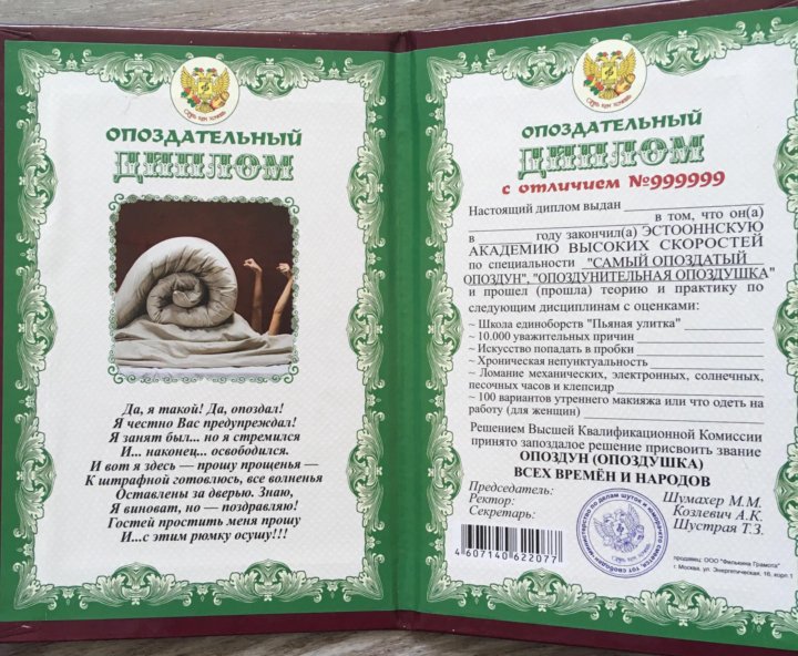 • Диплом главного опаздуна;