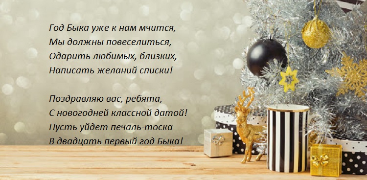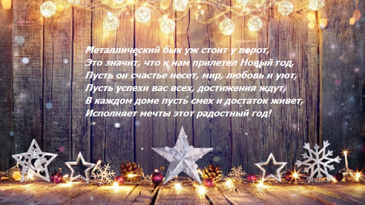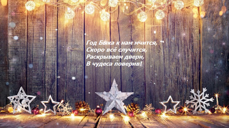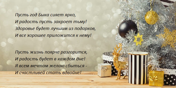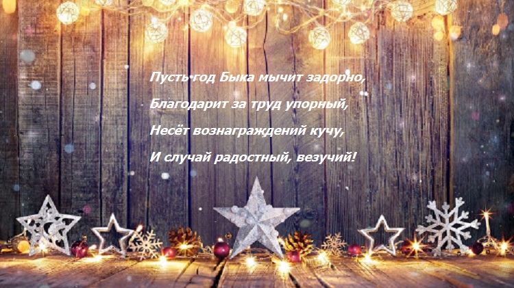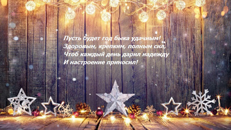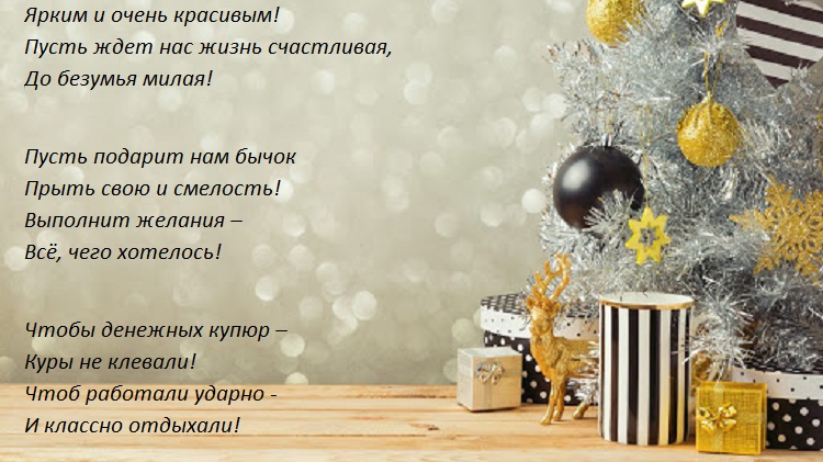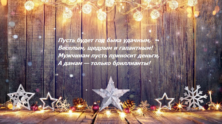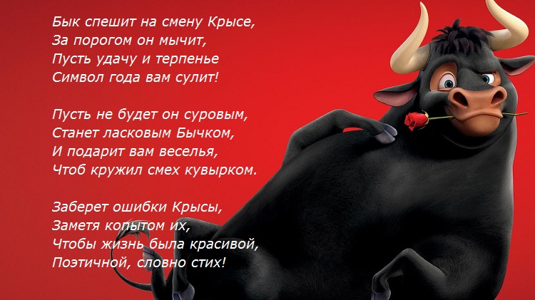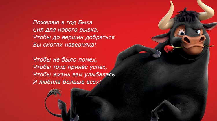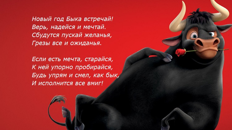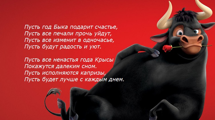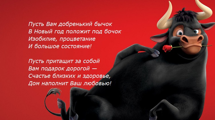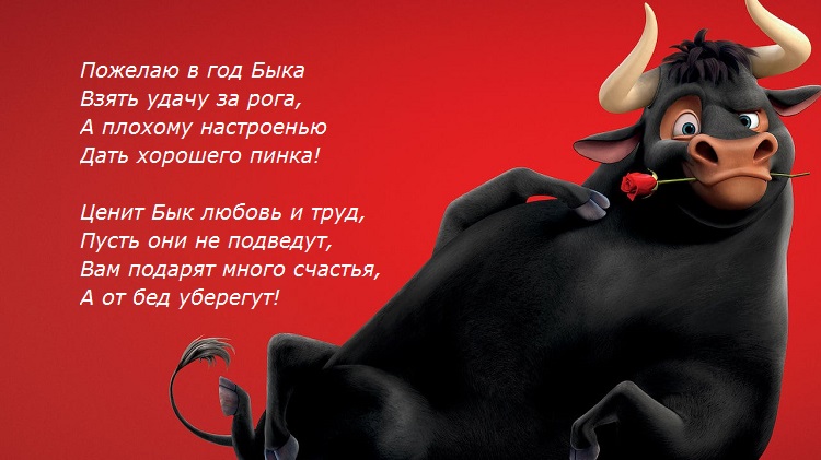 Хозяин года не любит шума, показывать свои эмоции на публике. Демонстрируйте свои эмоции более сдержанно. Для поздравления друзей подойдут прикольные, коротенькие, поздравительные стишки. Каждого, кто встретит Новый год с учетом предпочтений Быка, он щедро наградит.