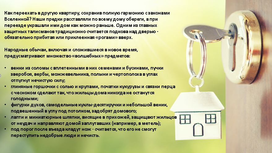 Наряду с организационными моментами по перевозке вещей, нельзя пренебрегать сложившимися обычаями и ритуалами, которые будут способствовать новой счастливой жизни.