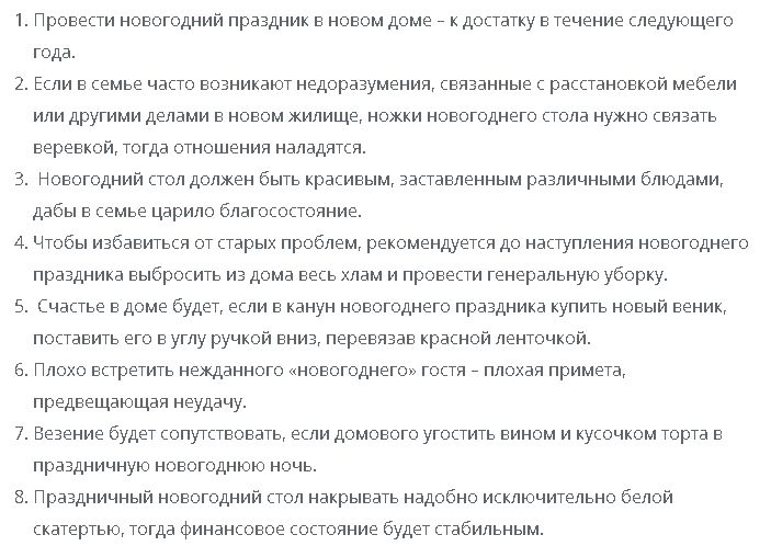 Если вам предстоит первый раз встретить Новый год в новой квартире, обязательно накройте стол и пригласите гостей. К тому, что должно стоять на столе из блюд, следует отнестись со всей ответственностью. Чтобы дом был полной чашей, должно быть разнообразие из овощей, фруктов, рыбы, мясных продуктов. А чтобы жизнь была сладкой, испеките именно сладкий пирог, который должны съесть полностью в новогоднюю ночь хозяева и гости. Под скатерть положите денежную купюру, а по середине стола горшок с денежным деревом.