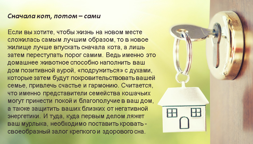 Кошки очень чувствительны к отрицательной энергии, по ее поведению вы заметите те места в квартире, от которых она будет шарахаться. Значит там есть скопление негатива и им следует уделить больше внимания при очищении квартиры с помощью святой воды или других средств. А там, где кошка ляжет, желательно, организовать спальное место. Кроме этого, считается, что первый, кто войдет в дом, принимает на себя все плохое, лучше пусть это будет кошка. При этом, беспокоиться за кошку не стоит, она прекрасно справится с этой проблемой.