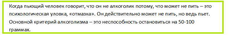 Если человек знает, что после выпитых 50 грамм, становится неуправляемым, даже более того неадекватным, он болен. Пока не выпита минимальная доза алкоголя, он может выполнять любую работу, даже управлять автомобилем, проводить сложные операции. Как только в организм поступает алкоголь, его вменяемость прекращается. Он становится опасным для общества, способен на такие поступки, от которых у многих идут мурашки по коже.