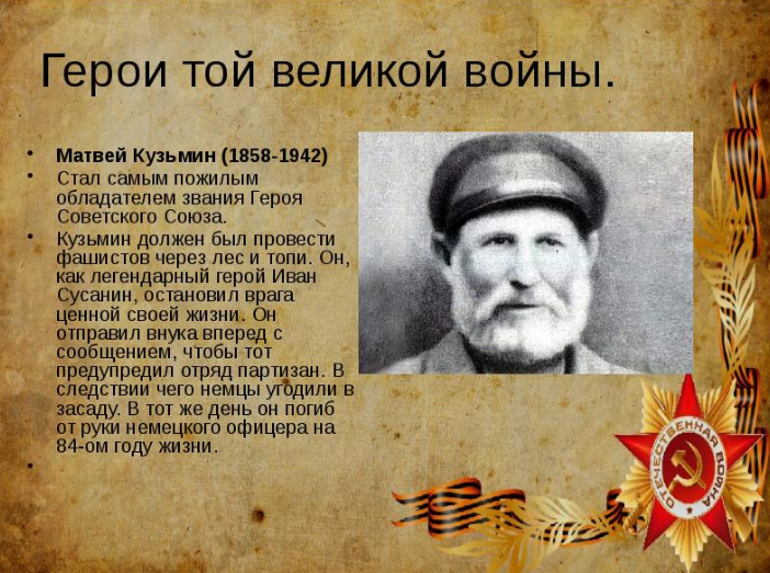 С самых первых дней войны советские люди проявили себя, как истинные патриоты. В небе, на воде и на земле они всеми силами, как могли боролись с врагом. Многие из них отмечены почетными наградами, есть и те, кто не пожалел своей жизни, лишь бы изгнать врага из своей страны.