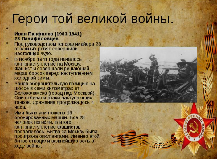 Весь народ встал на защиту своей Родины! Наши прадеды на фронт шли добровольцами, многие сражались в тылу врага, уходили в леса в партизанские отряды. Много подвигов было совершено не только на поле боя, но и там, где людям приходилось трудиться, практически, без сна, чтобы обеспечить армию всем необходимым. Прямо с конвейера перемещались на фронт танки, самолеты, артиллерия. К станку вставили женщины, дети, старики. Нельзя не отметить и медицинских работников, это врачи, спасавшие жизни солдат в полевых условиях, медсестры и санитарки, выносившие на своих плечах раненых бойцов с полей сражений. Только благодаря сплоченности, вере в нашу Победу, врага одолеть удалось.